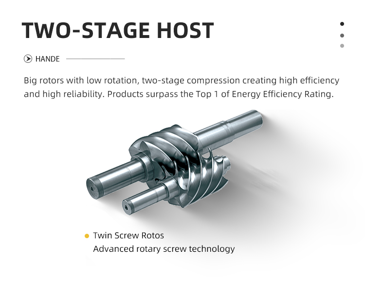 Independent intake and exhaust duct design:Precisely engineered airflow pathways ensure independent air intake for the filter, motor, and electrical cabinet. This prevents recirculation of heated air from within the enclosure, maintains intake air purity, reduces component wear caused by high temperatures and contaminants, and extends equipment service life. Multi-Stage High-Efficiency Cooler: A segmented design minimizes stress and deformation from thermal expansion and contraction, enhancing operational stability. It also simplifies disassembly and reassembly, reducing maintenance complexity and costs. Lift-and-Rotate Oil-Gas Separation Tank:All pipelines are integrated into the tank structure, eliminating fittings on the tank cover. This innovative design resolves the complexity of traditional piping connections. Advanced Compression Technology: By combining large-rotor, low-speed design principles with two-stage compression, the system achieves high efficiency even at low pressure ratios. The full product line exceeds China' s Grade 1 energy efficiency standards by 3%-5%, delivering energy savings of over 20%.