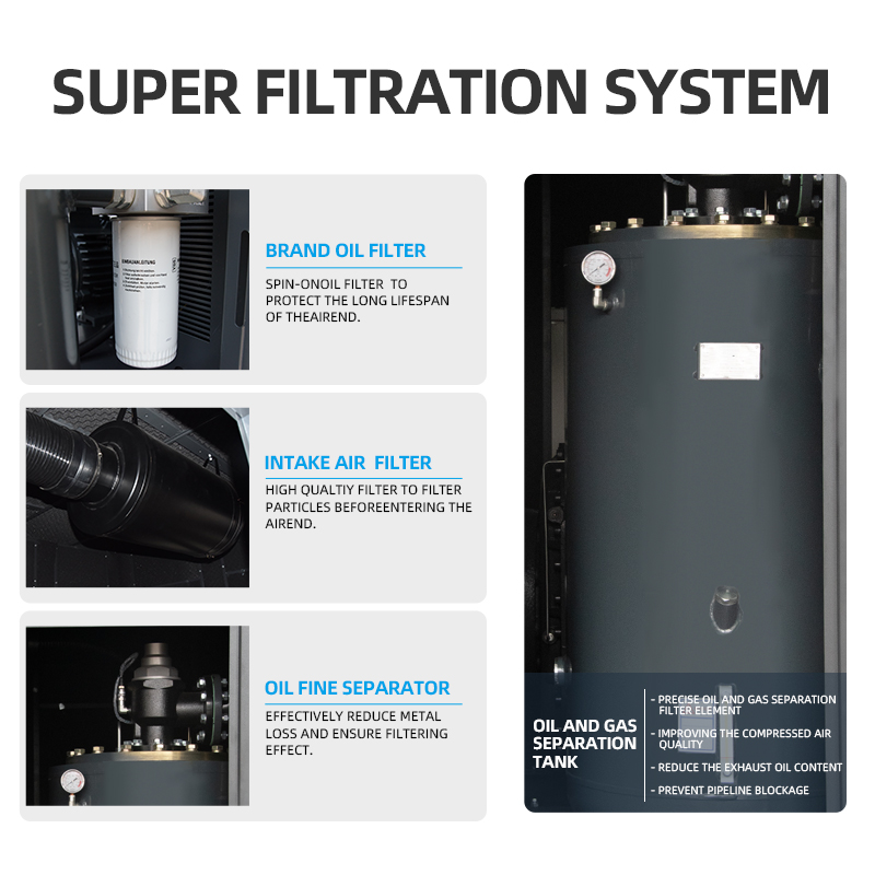 Adopting a dual stage host with high energy efficiency, it is efficient, low-noise, low vibration, stable and reliable. Each compression stage operates at a lower compression ratio, reducing internal leakage and improving volumetric efficiency. With dual-stage compression and an optimized low-pressure ratio design, the system ensures high efficiency and operational reliability. The full product series meets Grade 1 energy efficiency standards. Universal frequency converters form a variable frequency speed control transmission system, saving energy, reducing production costs, and improving productivity; Easy to operate, capable of easily achieving remote intelligent monitoring and management